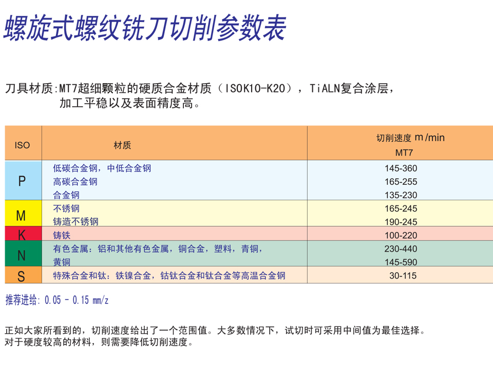 螺旋式螺纹铣刀片是CPT的独家产品。螺旋式螺纹铣刀可实现平稳切削、高进刀量、缩短加工时间。刀具可用于大小加工中心等多种机床。独一无二的带紧固螺钉的夹紧系统可实现高精度夹紧,大大减少了震动,螺纹表面精度高,MT7超细颗粒基体,带TiAN复合涂层(ISOK10-K20),适用于中高速切削及加工各种材料。