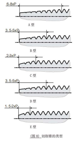 综上所述,最常用的切削锥为B型(通孔)和C型(盲孔),当盲孔螺纹收尾较短(<2.5个牙)时,应采用 E型短锥形。