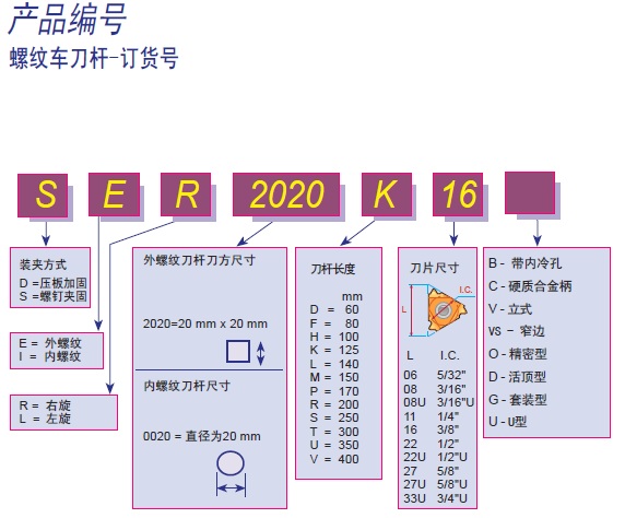 CPT除了提供内螺纹车刀杆和外螺纹车刀杆外,有压板式和螺钉夹紧式两种刀片装夹方式。刀杆的长度从60-400 mm。 还可提供带内冷及整体硬质合金螺纹车刀杆。请注意,CPT的螺纹车刀杆只能和CPT螺纹车刀片相匹配, 而与其它品牌的螺纹刀片不相配。另外,螺纹车刀杆还要和垫片相配。详情见技术资料部分或与我们技术人员联系!