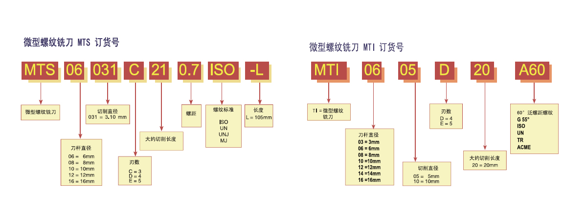 微型螺纹铣刀分MTS和MTI。MTS硬质合金材质MT7:超细颗粒的硬质合金材料(ISOK10-K20),TiALN复合涂层,加工平衡以及表面精度高。MTI用于深孔螺纹加工,硬质合金材质T8:超细颗粒硬质合金材料,PVD涂层(ISOK10-K20)。高耐热性,切削流畅,用于高效和普通加工,适合大多数材料的加工。